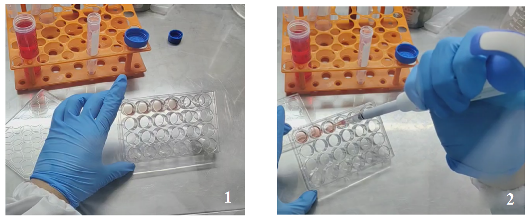 After collecting the organoids, add 25 times the volume of Matrigel to resuspend (the ratio of Matrigel volume to cell pellet volume is 25:1), with 25 μl per well (as shown in Figure 8). Spread the Matrigel in a 24-well cell culture plate and let it set in the incubator for 10-15 minutes. Then, add 500 μl to 750 μl of human colorectal cancer organoid culture medium A (as shown in Figure 9).