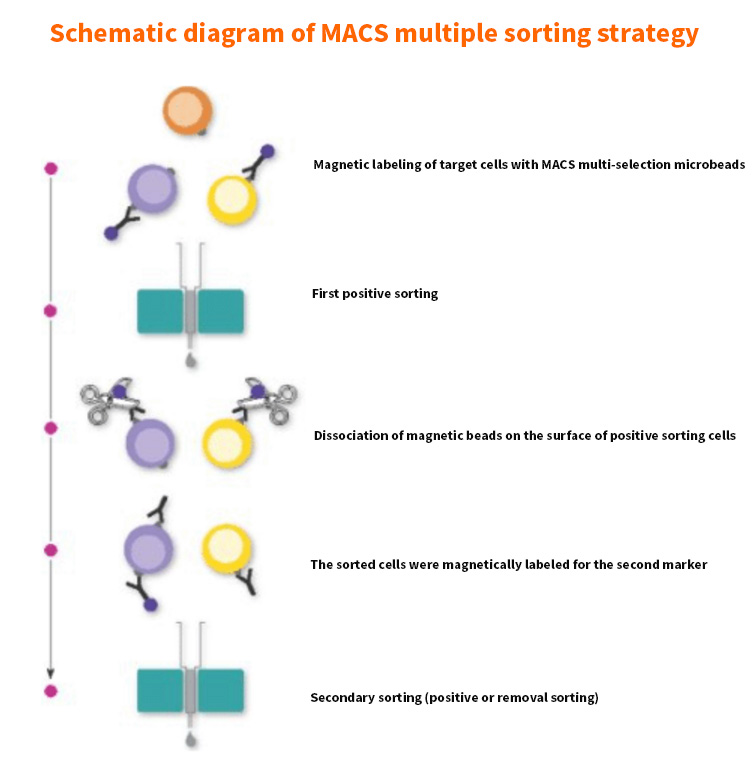 Multiple sorting: There are two schemes: scheme 1: negative sorting + positive sorting, that is, some non-target cells are removed first, and then positive sorting is carried out; Scheme 2: Multi-selection magnetic beads + positive/negative sorting, that is, first use multi-selection magnetic beads to positive sort cells, shearing and removing the magnetic beads, and then perform secondary sorting on the sorted cells;