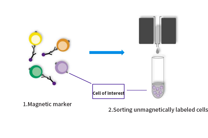 Negative sorting: magnetically label non-target cells and remove them from the cell mixture, that is, the magnetically labeled cells are the target cells. Negative sorting is also called removal sorting;