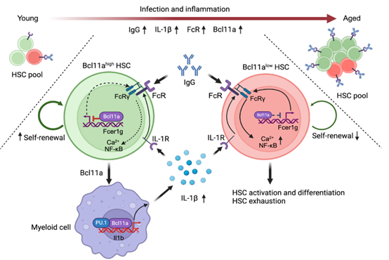 - Non-cell-autonomous damage: Bcl11a promotes IL-1β secretion by myeloid cells, activating the IL-1β–*Fcer1g* axis and accelerating HSC exhaustion.