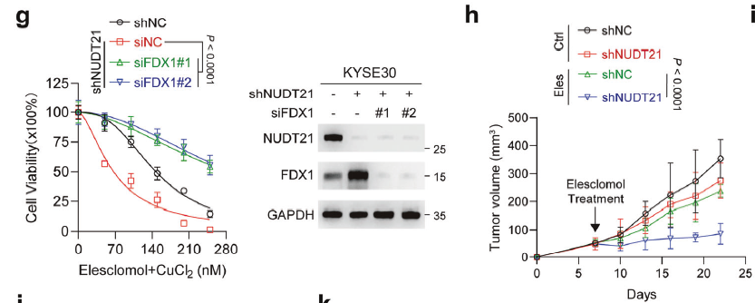 NUDT21 depletion re-sensitizes ESCC to elesclomol (3-fold IC₅₀ reduction), an effect fully rescued by FDX1 knockdown. Importantly, Absin Copper Microplate Assay confirmed that total copper content remained unchanged across genotypes (Suppl. Fig. S9g), rigorously excluding copper accumulation artefacts and cementing FDX1-dependent functional regulation.