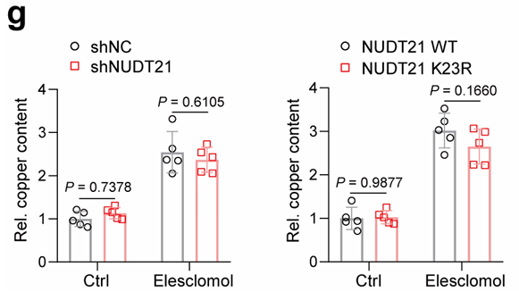 - Key result: no significant difference in total copper among control, NUDT21-KD and K23R groups (P > 0.05, Suppl. Fig. S9g), formally eliminating copper-level artefacts and reinforcing the FDX1-centric mechanism.