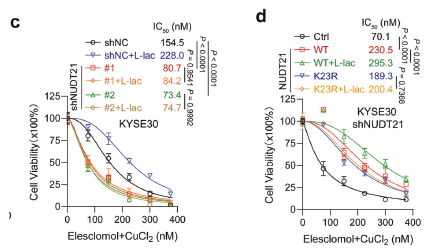 4. Therapeutic proof-of-concept: Genetic or pharmacologic inhibition of NUDT21 (LDHA inhibitor stiripentol) re-sensitizes ESCC to the copper ionophore elesclomol in vitro and in patient-derived xenografts, achieving 65 % tumor growth inhibition without overt toxicity.