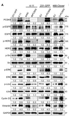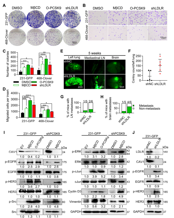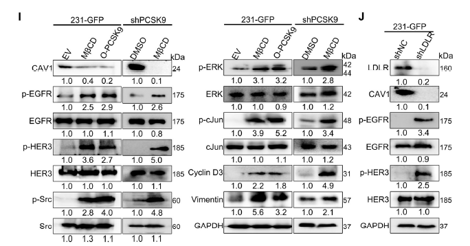 - Mechanistic dissection: A step-wise investigation integrating cholesterol metabolism, lipid-raft integrity and signal-transduction revealed the sequential axis PCSK9→LDLR degradation→plasma-membrane cholesterol reduction→EGFR/HER3 activation→Src/ERK/c-Jun signalling.