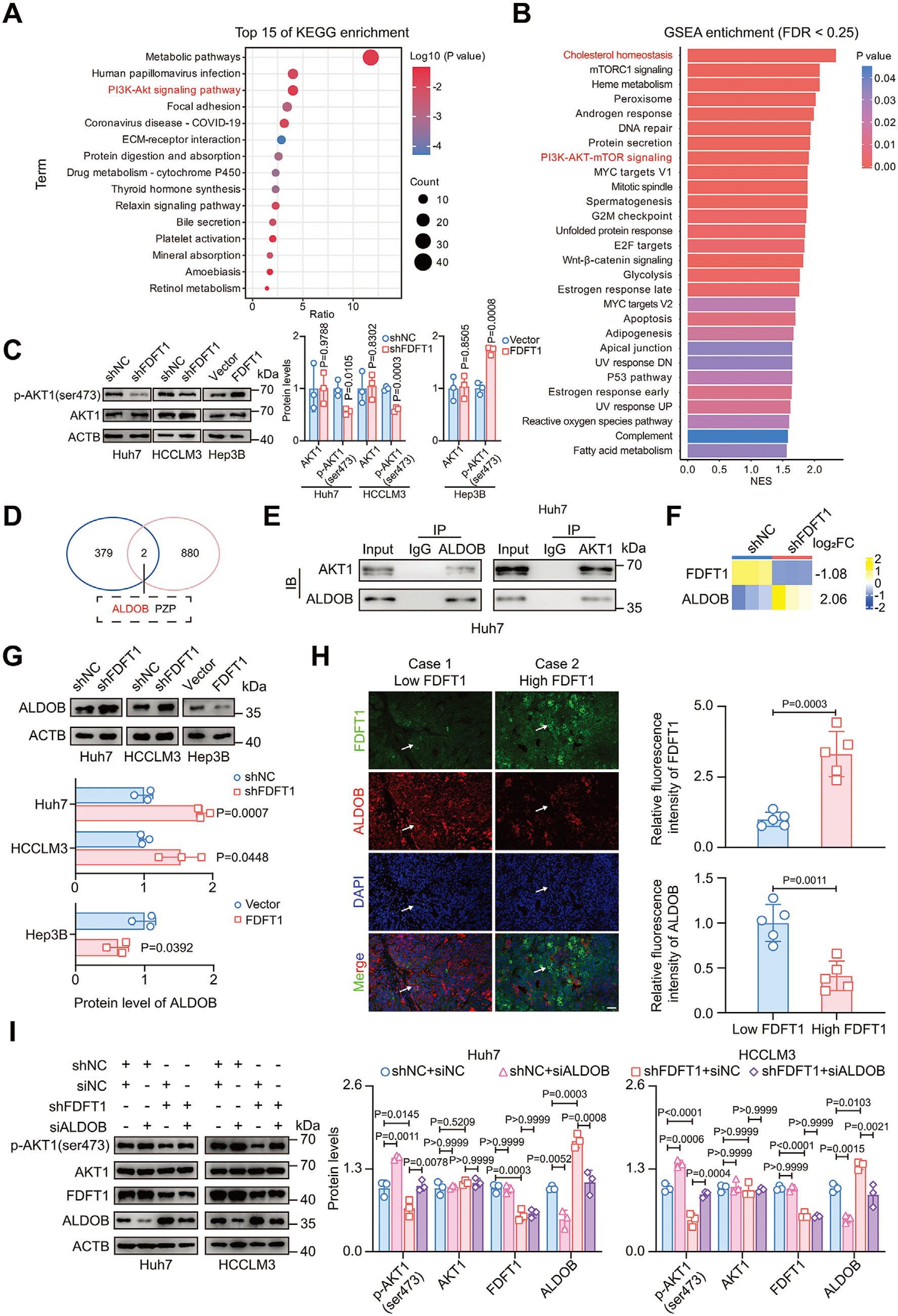 RNA-seq, Co-IP, ChIP–qPCR and rescue assays mapped the axis: FDFT1↓ → cholesterol & bile acids↓ → HNF4A transcriptional activity↑ → HNF4A occupies ALDOB promoter → ALDOB transcription↑ → ALDOB binds AKT1 and blocks its phosphorylation → HCC progression restrained.