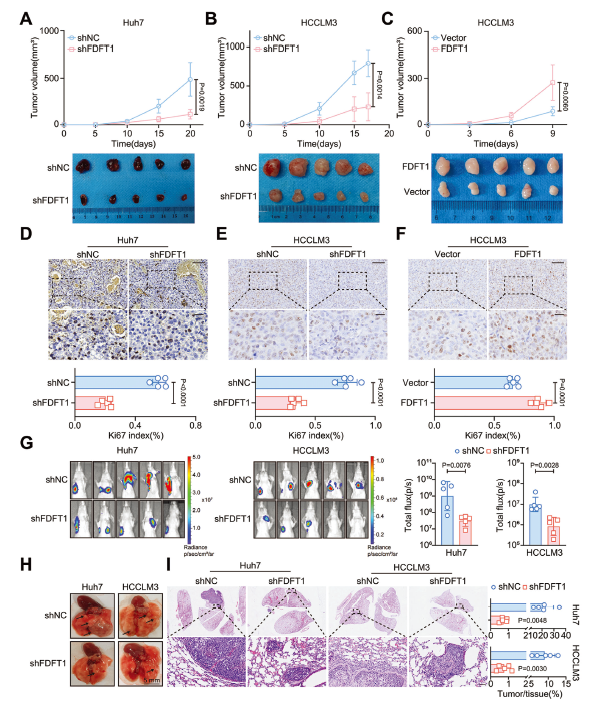 Multi-cohort analyses (TCGA, ICGC, n=90 IHC cohort) revealed FDFT1 up-regulation positively correlates with tumor size, distant metastasis and BCLC stage. High FDFT1 expression predicts shorter OS (P<0.0001) and higher metastatic risk (P=0.024) (Fig. 1).