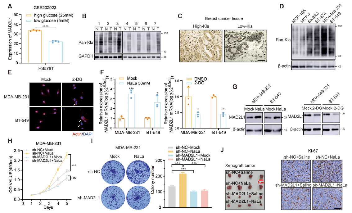 High-glucose culture increased global lactylation and MAD2L1 protein (Fig. 1B/C). Tumor size positively correlated with tissue lactylation (Table 1). Silencing MAD2L1 abolished lactate-induced proliferation (Fig. 1H–J), establishing MAD2L1 as the critical downstream effector.