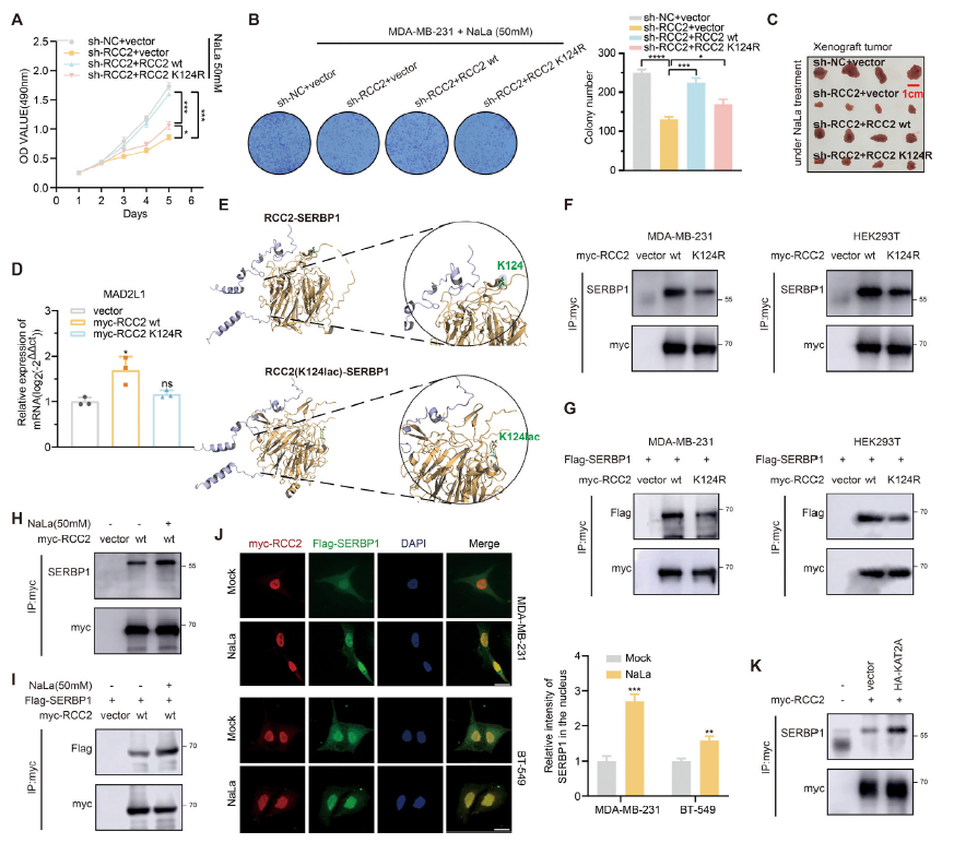 Truncation mutagenesis and LC-MS pinpointed K124 as the conserved lactylation site (Fig. 3B–C, E). KAT2A was identified as the acyl-transferase catalyzing RCC2-K124-lactylation (Fig. 3F–G, K). Lactylation strengthened RCC2–SERBP1 association and promoted nuclear translocation of SERBP1 (Fig. 6F–J).