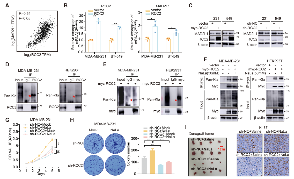 IP–MS identified RCC2 as a heavily lactylated protein (Fig. 2D-E). RCC2 and MAD2L1 expression were tightly correlated. RCC2 over-expression up-regulated MAD2L1, whereas RCC2 silencing reversed lactate-mediated induction of MAD2L1 and proliferation (Fig. 2B–C, G–I).