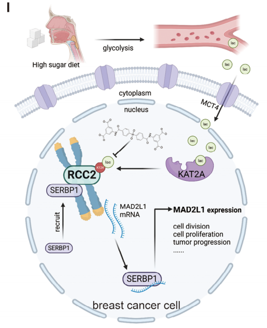 The study delineates a complete pathway: high glucose → lactate → KAT2A-mediated RCC2-K124 lactylation → SERBP1 nuclear import → MAD2L1 mRNA stabilization → breast-cancer proliferation (Fig. 7I). Small-molecule SBDA disrupts this oncogenic circuit, offering a tractable therapeutic avenue for sugar-associated breast cancers.