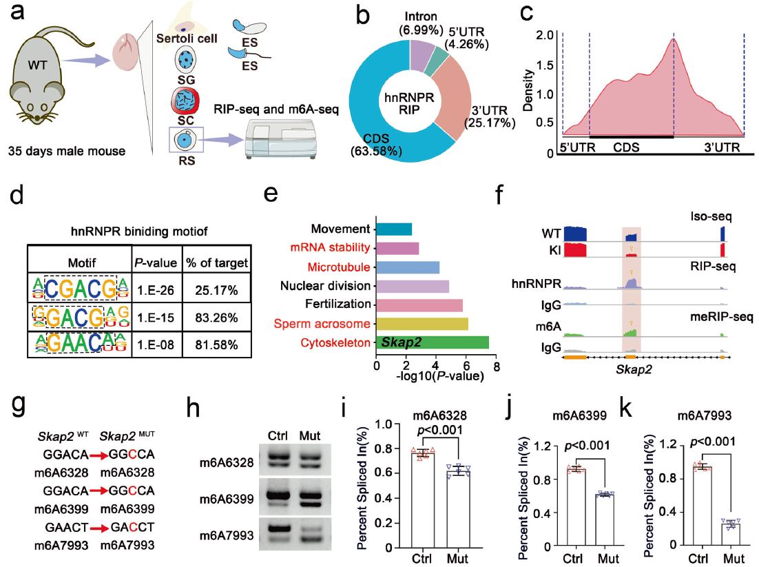 - Molecular-mechanism elucidation: Integrating scRNA-seq, proteomics, and RIP-seq revealed a “mutation → splicing aberration → functional defect” axis: hnRNPR, in an m6A-dependent manner, regulates alternative splicing of Skap2 pre-mRNA, thereby controlling cytoskeletal remodeling and mitochondrial alignment in spermatids.