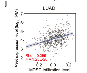 - TCGA data confirm positive correlation between PVR transcript levels and intratumoral MDSC infiltration, intensifying immunosuppression (Fig. 1j).