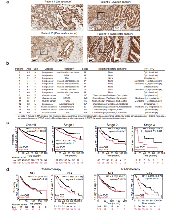 - IHC of clinical samples shows broad PVR expression in lung, ovarian, pancreatic and other malignancies (sFigure 1a,b), with high expression correlating with shortened survival in lung adenocarcinoma patients (sFigure 1c,d);