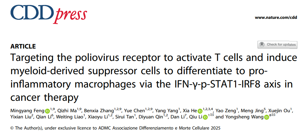 This study establishes PVR as a pan-cancer immunotherapeutic target and unveils the IFN-γ–p-STAT1–IRF8 axis as a previously unrecognized pathway capable of reversing MDSC-mediated suppression. The anti-PVR + anti-PD-1 regimen successfully resolves the longstanding cold-tumor resistance dilemma, exhibiting broad translational potential.