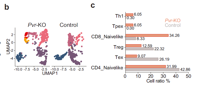 UMAP analysis and quantification of T-cell subsets in Pvr-KO vs control tumors