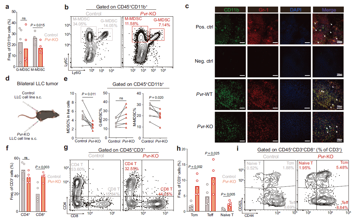 - PVR knockout reduces monocytic MDSC (M-MDSC) frequency while enriching CD8⁺ central-memory and effector T cells (Fig. 2a,f,h), tilting the TME toward a pro-inflammatory phenotype;