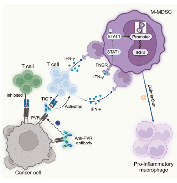 - Key mechanism: PVR blockade activates T cells to secrete IFN-γ, which via the IFN-γ–p-STAT1–IRF8 axis drives M-MDSC differentiation into pro-inflammatory macrophages, dismantling immune suppression (Fig. 7h).