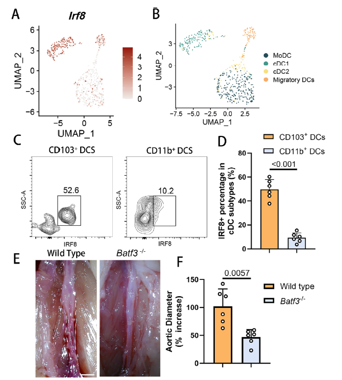 1. Scientific question: Although dendritic cells (DCs) are known to critically regulate AAA progression, the precise subtype(s) and upstream transcriptional control remain elusive. Does IRF8—a master regulator of cDC1 development—participate in AAA pathobiology?