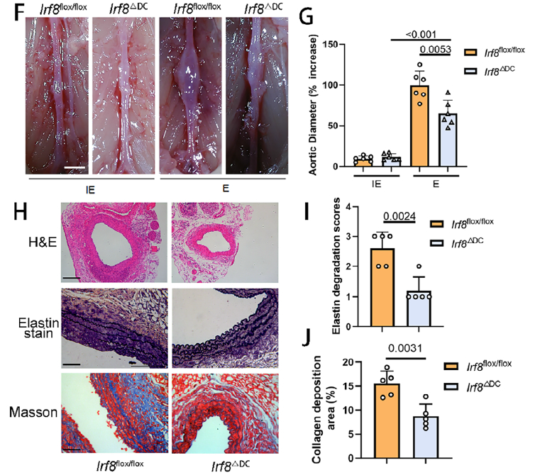- Irf8ΔDC mice: displayed markedly attenuated AAA expansion, preserved aortic architecture and diminished inflammation (Fig. 2F–J).
