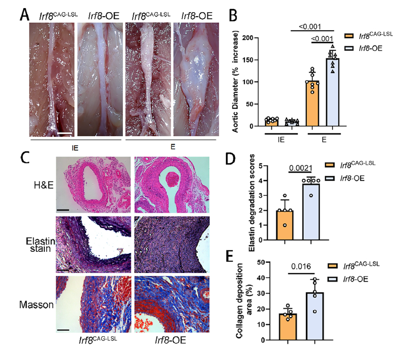 - Irf8-OE mice: exhibited aggravated AAA dilation, extensive elastin fragmentation, increased collagen deposition and pronounced inflammatory infiltration (Fig. 2A–E).