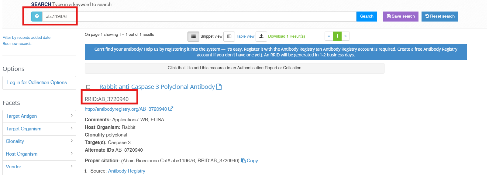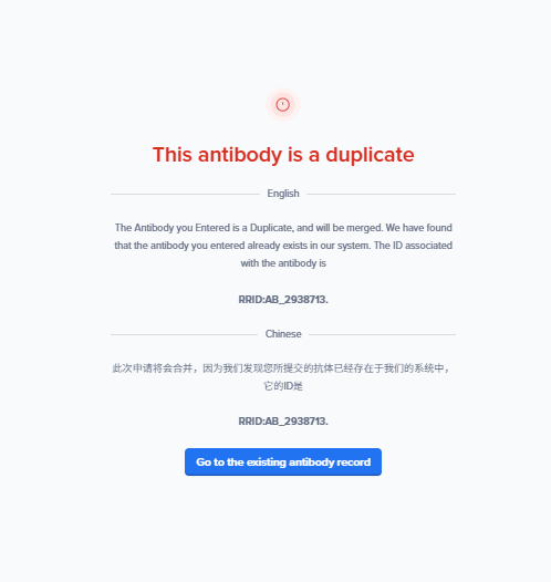 This indicates the resource has not yet been registered in the database. You may register it yourself or contact the antibody supplier to assist with registration.