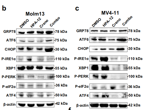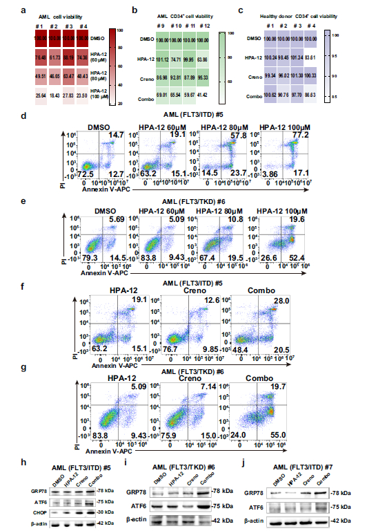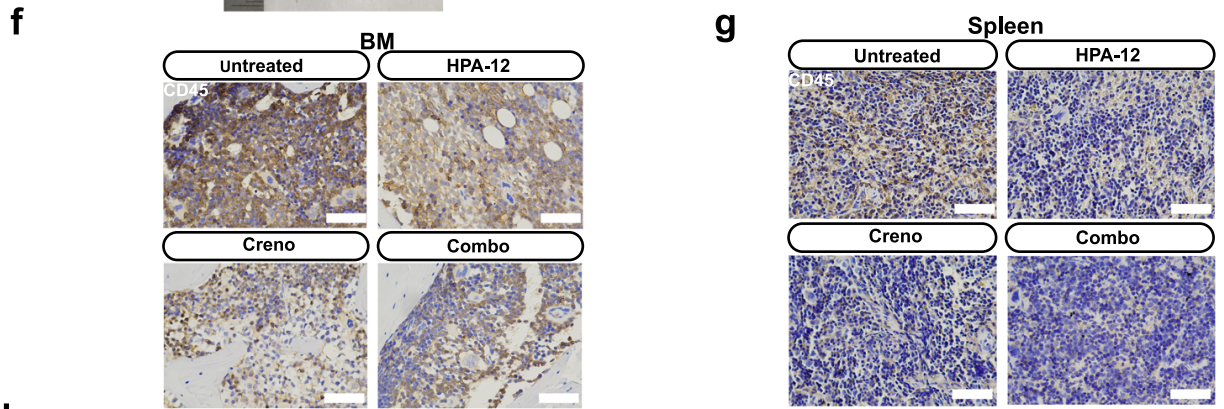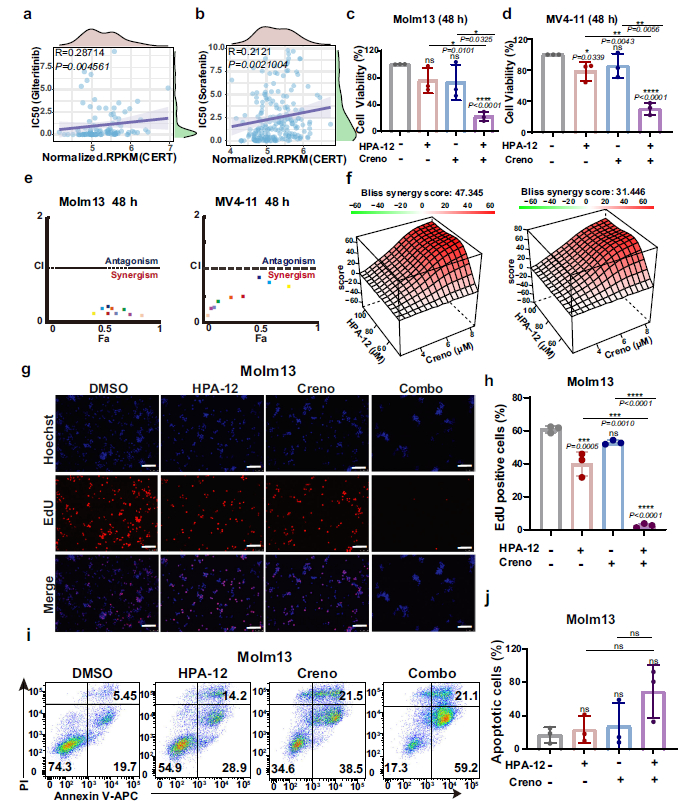 - In Vitro Experiments: Combined treatment with HPA-12 and Creno synergistically inhibited the viability of MV4-11 and Molm13 cells (combination index [CI] < 1, Fig. 2e, f), with significantly enhanced proliferation inhibition and apoptotic rates compared to monotherapy (Fig. 2h, j);
