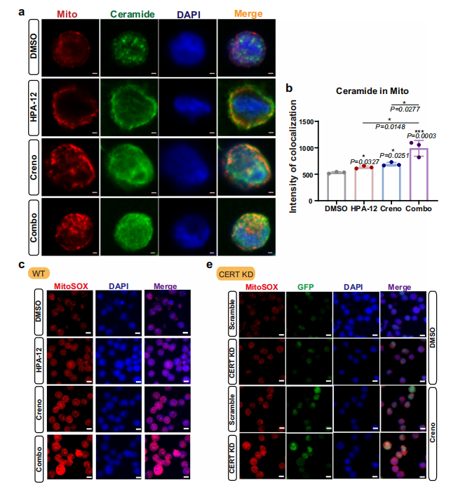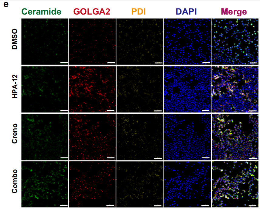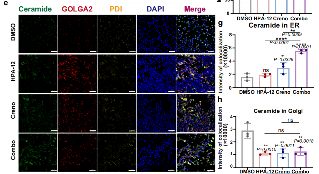 - Significantly elevated co-localization intensity between Cer and the endoplasmic reticulum in the combination treatment group (Fig. 4e, g), confirming ER accumulation of Cer;