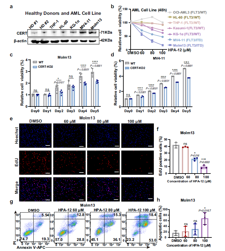 Western blot analysis revealed significantly elevated CERT protein expression in FLT3-ITD mutant AML cell lines (MV4-11, Molm13) compared to wild-type AML cells and healthy donor bone marrow cells (Fig. 1a). Both pharmacological inhibition of CERT by HPA-12 and genetic knockdown via shRNA resulted in dose-dependent suppression of FLT3-mutant AML cell proliferation (Fig. 1c, d, f) and induction of apoptosis (Fig. 1g, h), with minimal cytotoxicity toward normal hematopoietic cells.