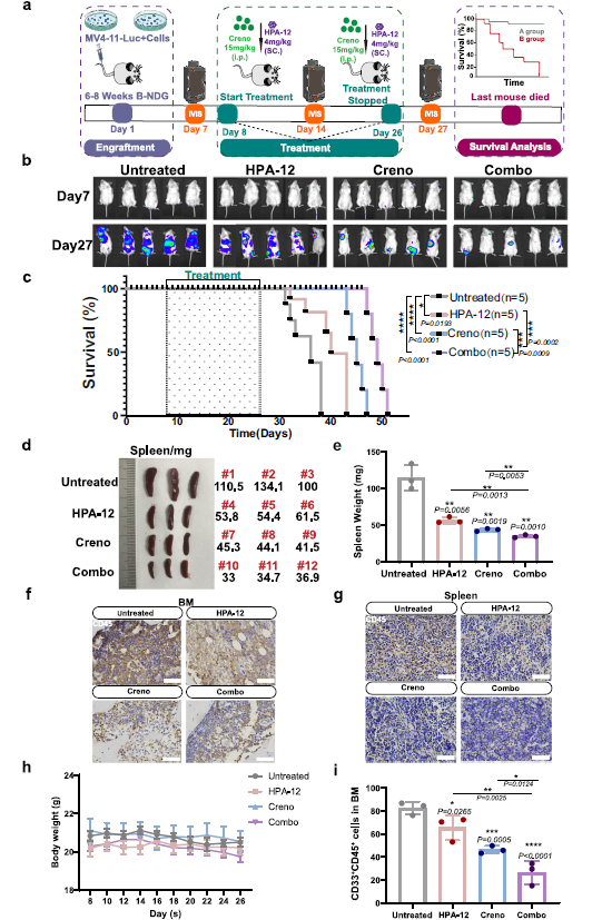 - In Vivo Experiments: In the MV4-11-luc+ xenograft model, combined therapy significantly reduced leukemia burden (Fig. 3b, f, g), ameliorated splenomegaly (Fig. 3d, e), and markedly prolonged survival (Fig. 3c);