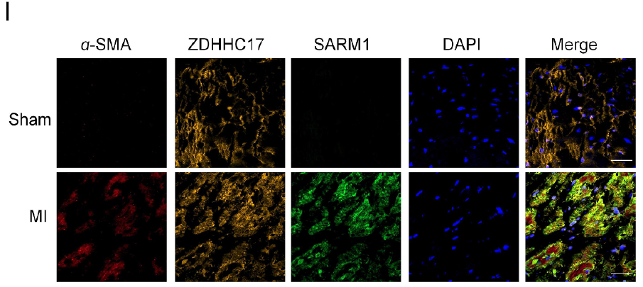Through multi-color labeling and co-localization analysis with this kit, definitive conclusions were reached: ZDHHC17 and SARM1 exhibit significant co-expression in cardiac fibroblasts, with their co-localization regions highly overlapping with the expression zones of the fibrosis marker α-SMA. These results directly demonstrate that ZDHHC17 and SARM1 undergo direct interaction at critical fibrotic sites (cardiac fibroblasts) during MI-induced fibrosis, providing histological evidence for the core mechanism of "ZDHHC17-mediated SARM1 palmitoylation."