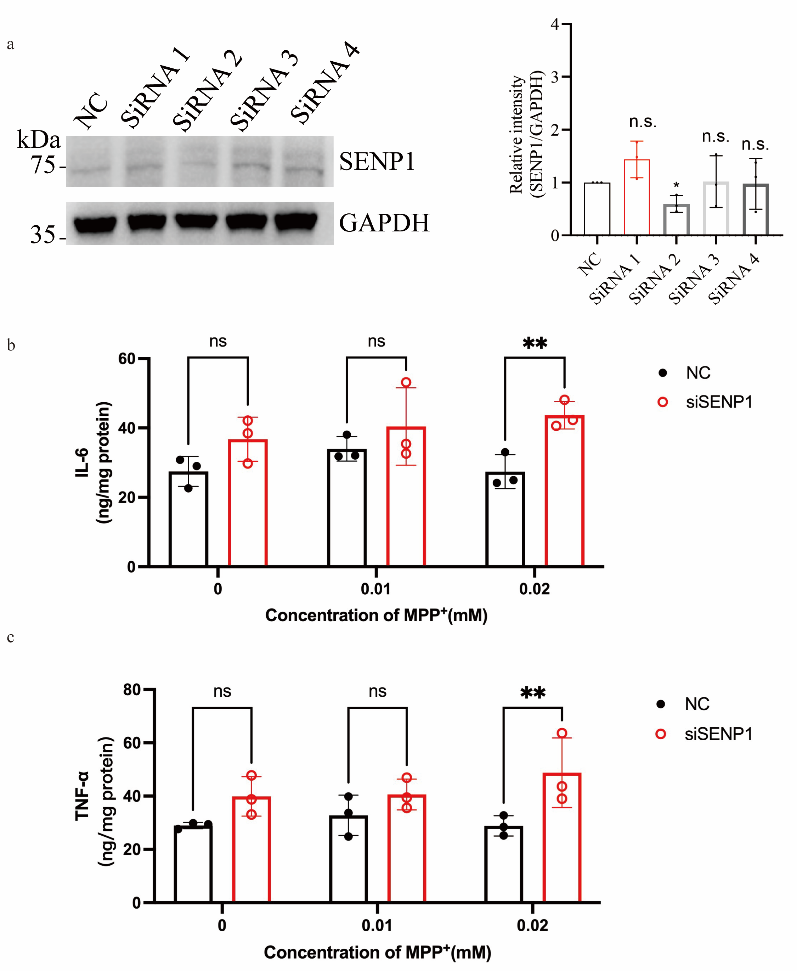 Researchers conducted experiments in BV2 microglial cells, treating cells with sub-threshold concentrations of MPP+ (0.01-0.02 mmol/L, insufficient to induce significant microglial activation or cytokine secretion) while silencing SENP1. Subsequently, IL-6 and TNF-α secretion was detected using Absin ELISA kits.