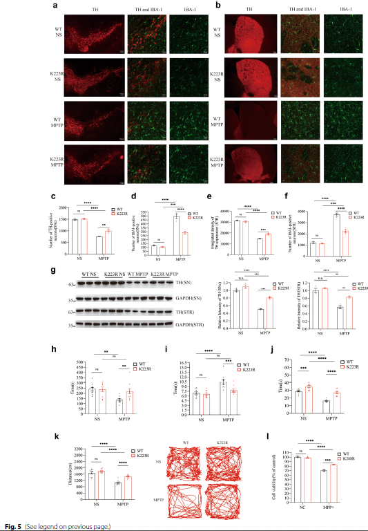 • Cell Viability and Behavioral Assays: MPP+ treatment caused significant reduction in SH-SY5Y cell viability (P < 0.0001; Fig. 2c); meanwhile, Sirt3 K223R mutant mice exhibited superior motor performance (rotarod test, pole test, wire suspension test, and open field test; Fig. 5h-k) and reduced dopaminergic neuronal loss (Fig. 5a-g) following MPTP treatment.