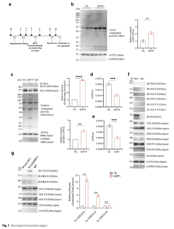 • Mitochondrial Protein Acetylation Levels: Following MPTP injection, acetylated protein levels in mouse ventral midbrain mitochondria were significantly elevated (P = 0.0016; Fig. 1b), indicating that MPTP alters mitochondrial protein acetylation status and potentially compromises function.