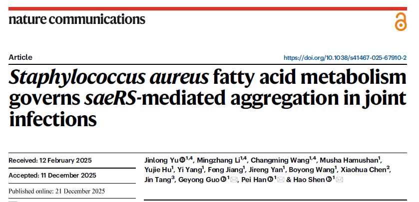 1. Novel Discovery in Aggregation Mechanisms: Definitive identification of the fak-saeRS-FnbA/B-fibrinogen axis as the critical pathway for S. aureus aggregation in joints, challenging the conventional paradigm that "aggregation equals biofilm" by demonstrating fundamental differences in formation kinetics, structural composition, and regulatory mechanisms;2. Novel Elucidation of Regulatory Patterns: First revelation of the dual-mechanism activation of SaeRS by the Fak system: (1) clearance of exogenous fatty acids to relieve their inhibition of SaeRS, and (2) maintenance of FMM integrity to facilitate SaeS localization (Fig. 5J);