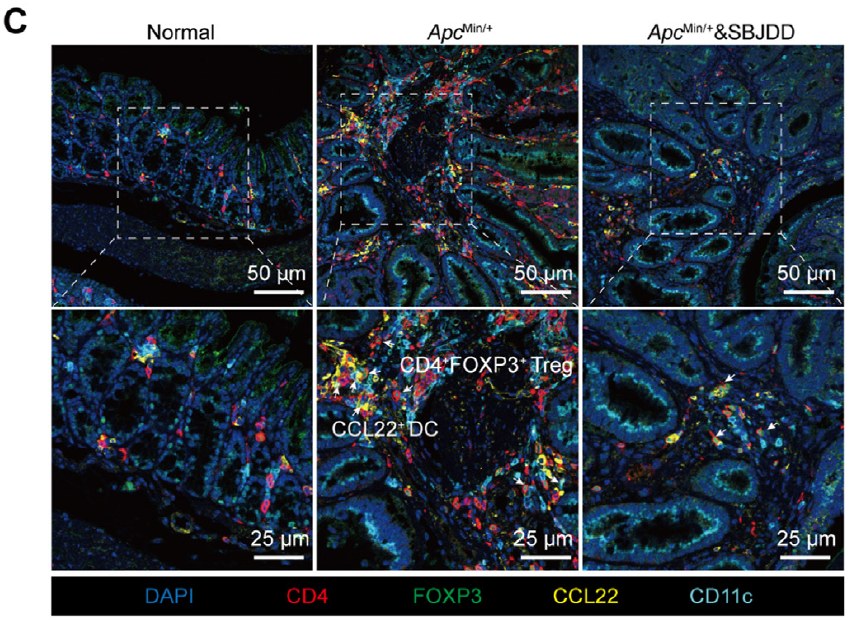 Clinical Validation of SBJDD Efficacy: In colorectal adenoma patients, SBJDD treatment significantly reduces adenoma volume while decreasing infiltration of CCL22+ DCs and Tregs in tumor tissues, confirming its clinical application value.