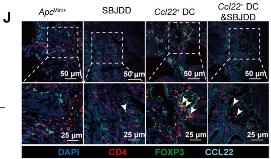 Elucidation of Core Anti-Cancer Mechanism of SBJDD: SBJDD significantly reduces infiltration of CCL22+ DCs and Tregs in colorectal cancer tissues, restoring tumor immune microenvironment homeostasis; intraperitoneal injection of CCL22+ DCs reverses SBJDD therapeutic efficacy, confirming this cell population as the key therapeutic target;