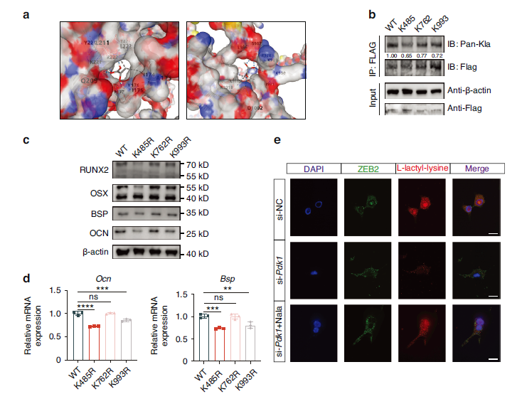 Through lactylome profiling, three lactylation sites on ZEB2 were identified (K485, K762, K993), with the K485 site being critical for mineralization regulation (Fig. 6a-b); PDK1 enhances ZEB2 lactylation through promoting lactate generation, thereby upregulating the expression of mineralization genes including RUNX2 and BSP (Fig. 6c-e).