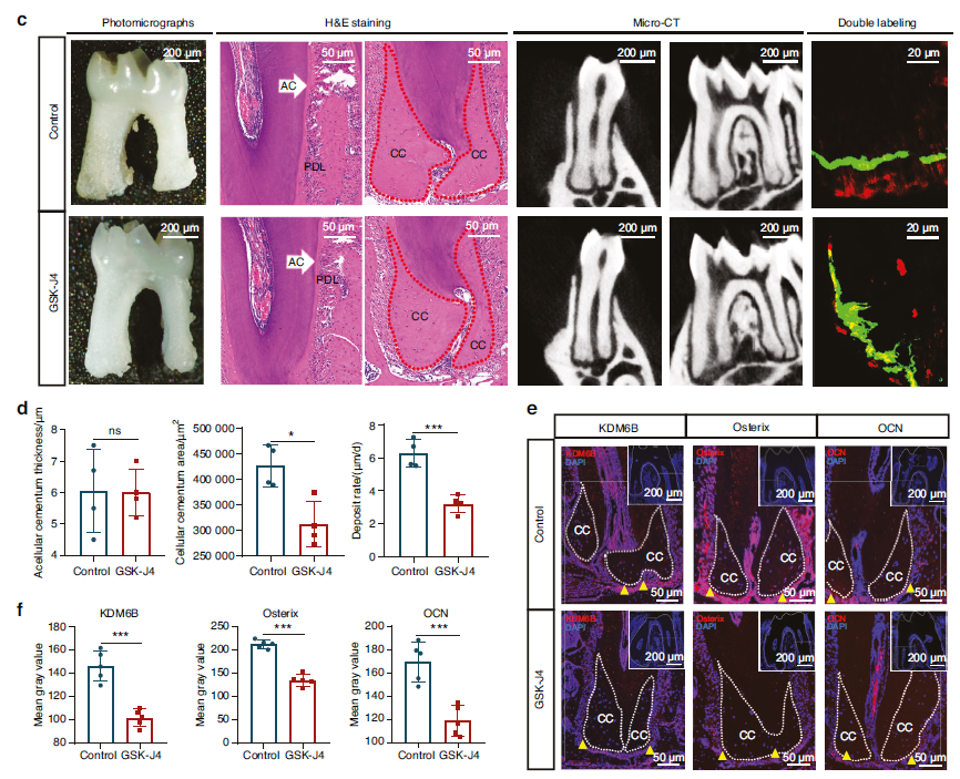 In vivo experiments demonstrated that following KDM6B inhibitor GSK-J4 treatment, mice exhibited thinning of the dentin-cementum complex and significant reduction in cellular cementum area (Fig. 2c-d), with decreased expression of mineralization markers OSX and OCN (Fig. 2e-f); in vitro experiments confirmed that KDM6B knockdown significantly impaired cementoblast mineralization capacity.