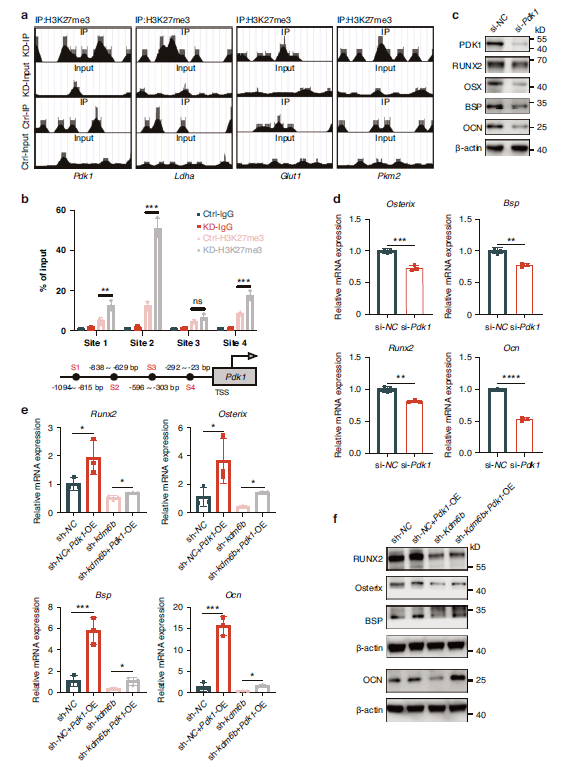 Fig. 4 KDM6B regulates cementoblast mineralization by targeting Pdk1. a Chromatin Immunoprecipitation (ChIP) sequencing detection of H3K27me3 peaks at 1 000 bp upstream of the transcription start sites of glycolysis-related markers under KDM6B inhibition. b By dividing Pdk1 upstream into 4 sites, ChIP-qPCR shows that inhibiting Kdm6b could upregulate H3K27me3 in these 4 sites (n = 3). c, d QRT-PCR and WB results indicate reduced mineralization levels after transient transfection with si-Pdk1 (n = 3). e, f QRT-PCR and WB assays reveal rescue of the mineralization phenotype following Pdk1 overexpression under Kdm6b inhibition. Data are presented as mean ± SD. *P < 0.05. **P < 0.01. ***P < 0.001. ****P < 0.000 1