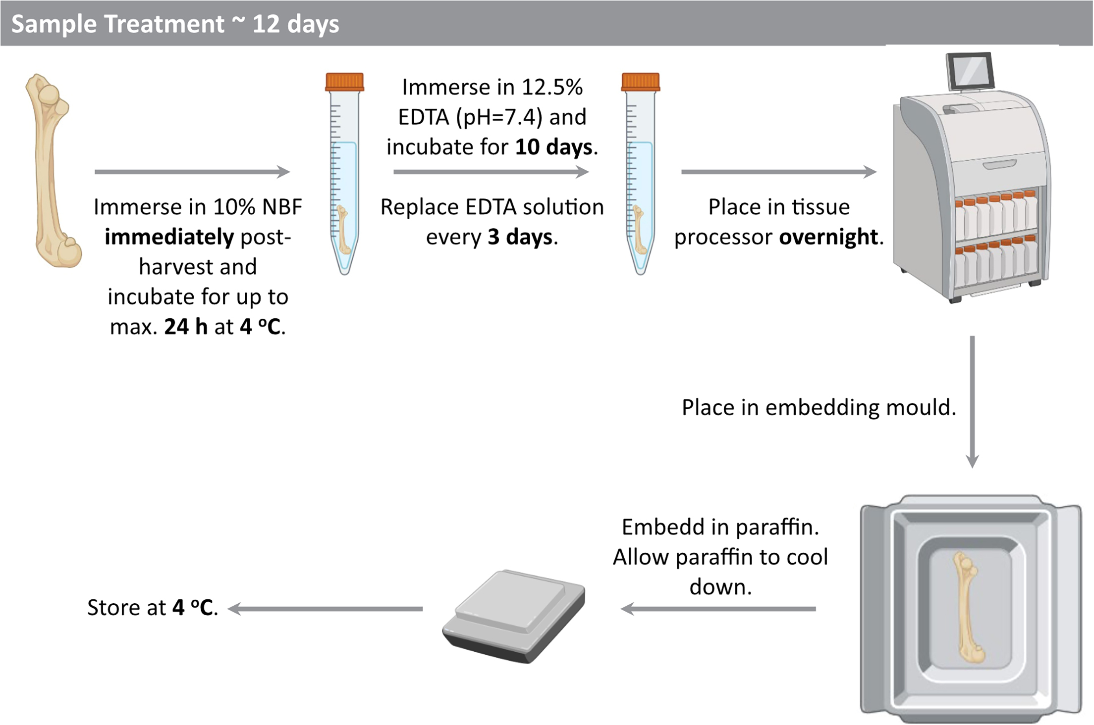 Figure 1: Standard workflow from bone tissue sampling to sectioning. After fixation, tissue must be immersed in EDTA decalcifying solution for several weeks to months until calcium is completely removed, followed by dehydration, clearing, paraffin infiltration, and final embedding and sectioning. The thoroughness of decalcification directly determines section quality and subsequent staining results.
