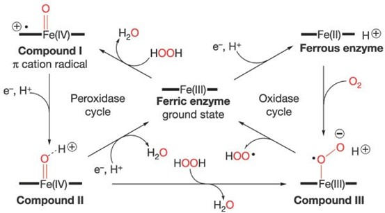 The TMB chromogenic reaction is based on the catalytic cycle mechanism of HRP. HRP is a heme-containing redox enzyme that, in the presence of hydrogen peroxide (H₂O₂), can catalyze the oxidation of TMB.